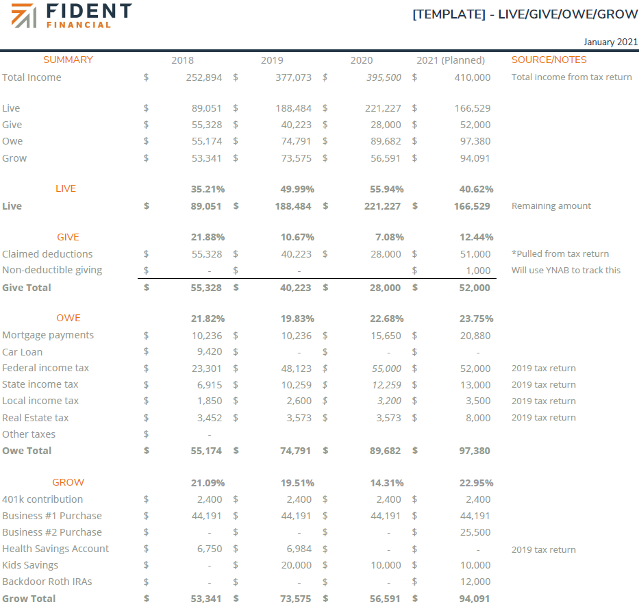 It's a great template for advisors to create for their clients to show how their annual income is allocated between four main areas: Give, Live, Owe, and Grow. It's relatively simple and you only need a client's tax return and a few other documents to build it out.